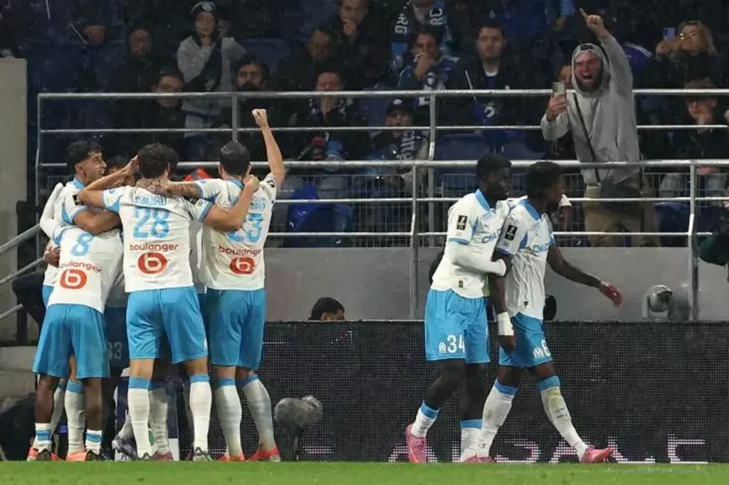 | Les joueurs marseillais fêtent devant leurs supporters leur deuxième but contre Strasbourg au stade de la Meinau le 26 septembre 2025. |