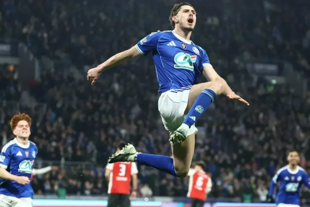 | L'attaquant argentin de Strabsbourg Joaquin Panichelli après avoir ouvert le score contre Reims en quart de finale de la Coupe de France le 3 mars 2026 au stade de la Meinau. |