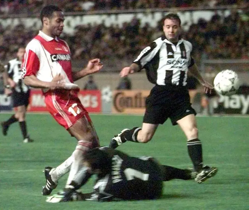 | Thierry Henry (gauche) sous le maillot de l'AS Monaco inscrit un but contre la Juventus en Ligue des champions, le 15 avril 1998 au stade Louis II. |
