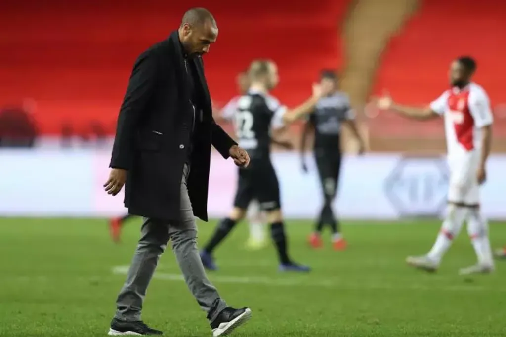 | Thierry Henry, dépité, à l'issue de la défaite de son équipe Monaco à domicile face à Guingamp, le 22 décembre 2018. |