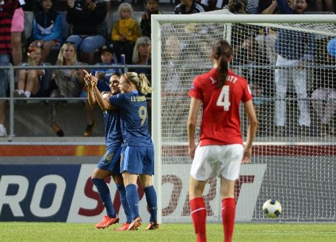 | Les Françaises Louisa Necib (gauche) et Eugénie Le Sommer célèbre un but, lors d'un match contre l'Angleterre, le 18 juillet à Linköping. |
