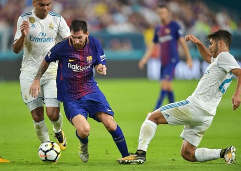| Lionel Messi (maillot bleu-rouge), grâce à un but et une partie pleine, a permis au Barça de remporter l'International Champions Cup en dominant le Real Madrid (3-2), le 29 juillet 2017 à Miami. |