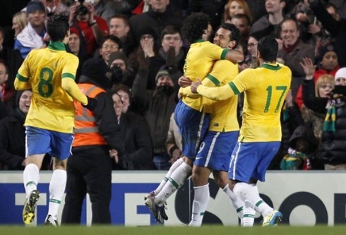 | Les joueurs brésiliens comblent de joie suite à un but marqué par Fred (2e à droite) contre la Russie, le 25 mars à Londres. Photo : AFP/VNA/CVN |