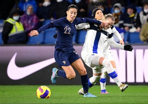 | L'attaquante française Clara Matéo, aux prises avec la défenseure finlandaise Emma Koivisto, au Tournoi de France, le 16 février au Stade Océane au Havre. |