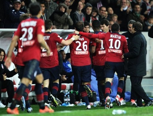 | L'attaquant de Lille, Nolan Roux est félicité par ses coéquipiers après son but au bout de la prolongation lors du match contre Toulouse. Photo : AFP/VNA/CVN |
