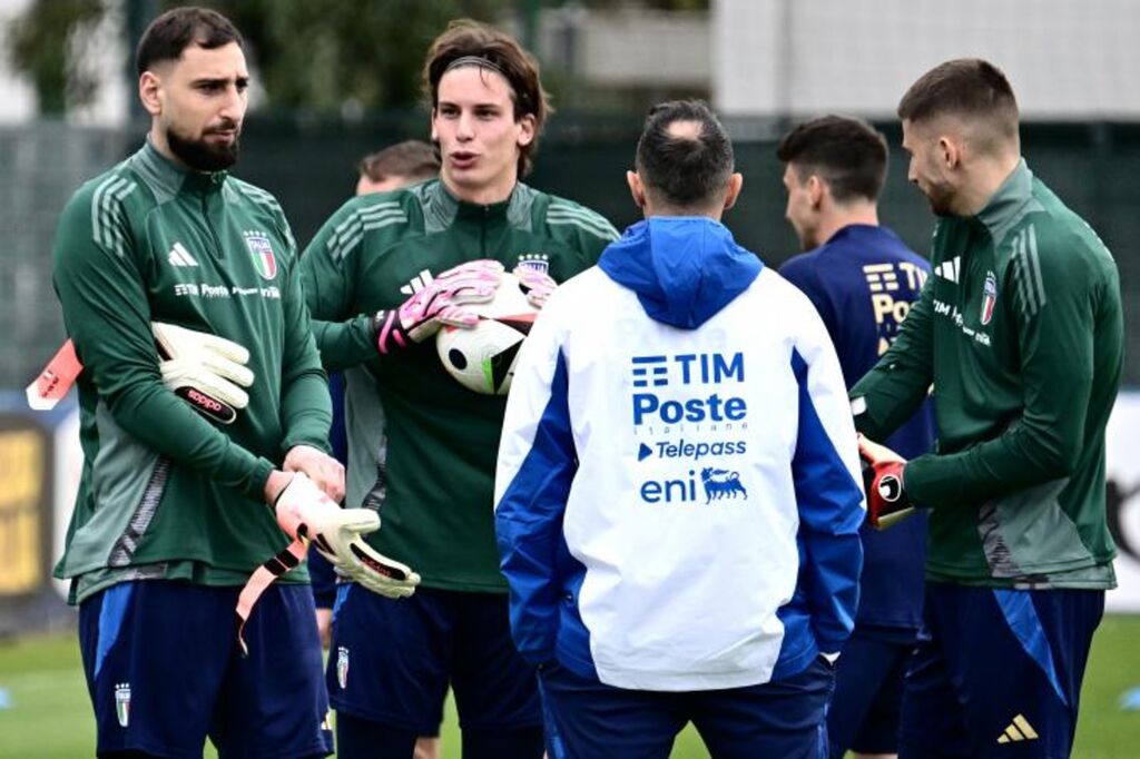 | Le gardien de but du PSG et de l'Italie Gianluigi Donnarumma et Marco Carnesecchi à l'entraînement le 18 mars. |