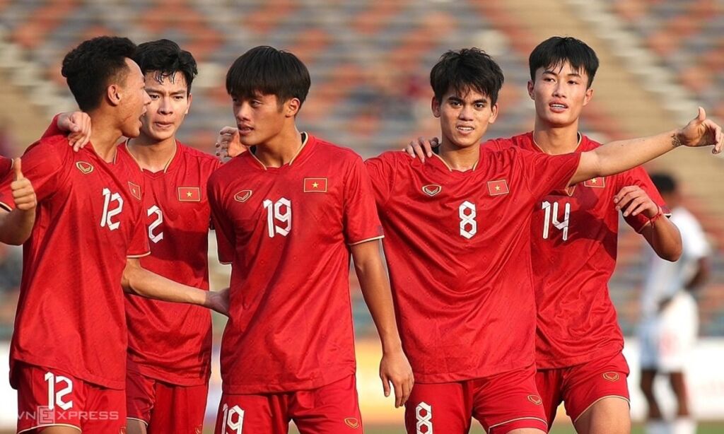 | L'équipe du football vietnamien lors d'un match aux SEA Games 2023 au Cambodge. |