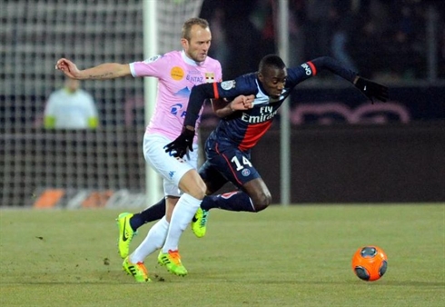 | Le milieu de terrain d'Evian-Thonon Olivier Sorlin avec Blaise Matuidi du PSG le 4 décembre à Annecy |