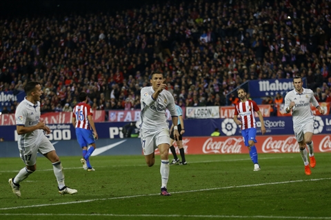 | L'attaquant du Real Madrid, Cristiano Ronaldo, fête le 1er but face à l'Atletico, le 19 novembre 2016 à Vicente Calderon. |