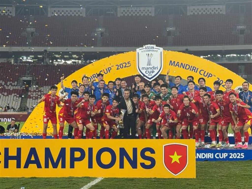 | Les U23 vietnamiens brandissent le trophée du Championnat d’Asie du Sud-Est 2025 au stade Gelora Bung Karno, le 29 juillet. |