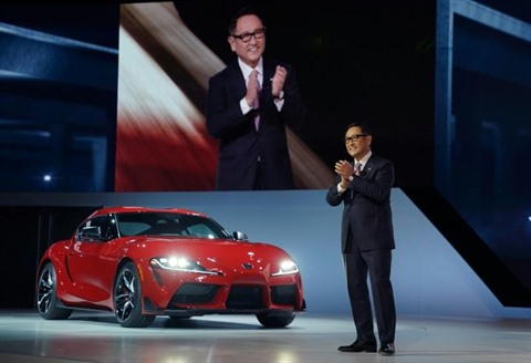 | Akio Toyoda, patron de Toyota, dévoile la sportive légendaire Supra le 14 janvier à Detroit). |