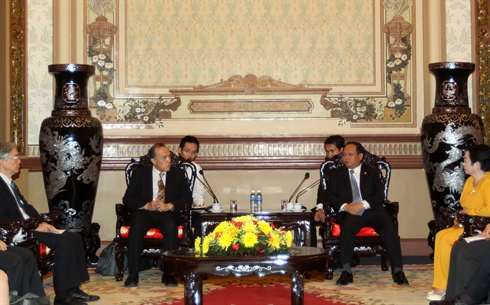 | L'entretient entre le vice-président du Comité populaire de Hô Chi Minh-Ville, Tât Thành Cang (à droite), et le directeur général de l’Autorité nationale du personnel du Japon, Kozo Yoshida. |