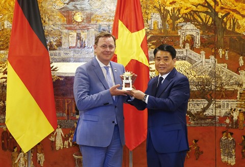 | Le gouverneur Bodo Ramelow du Land de Thuringe (gauche) et le président du Comité populaire de Hanoï, Nguyên Duc Chung, le 8 avril à Hanoï. |