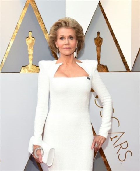 Jane Fonda, en fourreau blanc, portait un badge Time's Up, l'association fondée par quelque 300 femmes influentes d'Hollywood pour défendre les victimes de harcèlement sexuel.