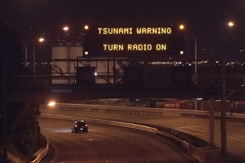 | Un panneau d'alerte au tsunami au-dessus de l'autoroute 1 à Wellington le 14 novembre après un tremblement de terre de magnitude 7,8 qui a secoué en pleine nuit la Nouvelle-Zélande. |
