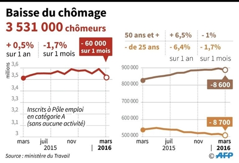 Même si le chômage reste à des niveaux très élevés (3,53 millions de demandeurs d'emploi sans activité), la nouvelle tombe bien après les mauvais chiffres de février (38.400 nouveaux inscrits à Pôle emploi), et à deux jours d'une quatrième journée de mobilisation contre la loi travail à l'appel de sept syndicats de salariés, étudiants et lycéens.