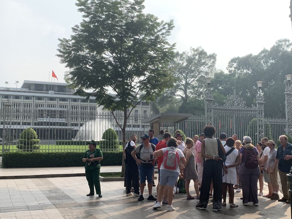 | Une délégation de touristes étrangers devant le Palais de la réunification à Hô Chi Minh-Ville. |