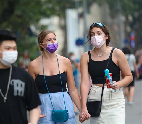 | Les touristes étrangers sur la rue piétonnière de Hanoï. |