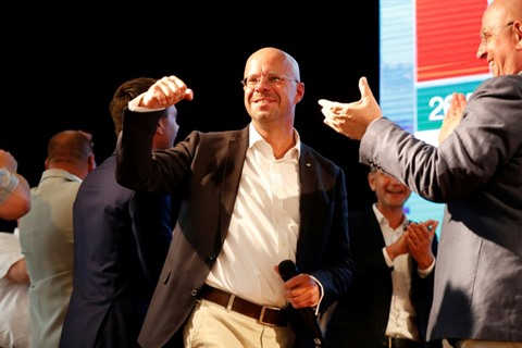 | Andreas Kalbitz, candidat du parti AfD dans le Brandebourg, réagit aux premiers résultats des élections, le 1er septembre 2019 à Werder an der Hava, près de Potsdam, en Allemagne. |