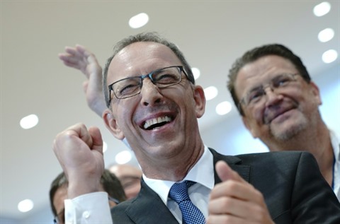 | Le candidat du parti AfD pour la Saxe, Joerg Urban, réagit aux premiers résulats des élections, le 1er septembre 2019 à Dresde, en Allemagne. |