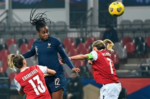 | La Française Marie-Antoinette Katoto (gauche) marque de la tête contre l'Autriche en qualifications pour l'Euro-2022, le 27 novembre à Guingamp. |