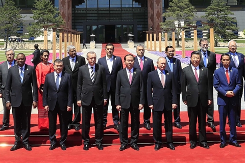| Le président Trân Dai Quang (1er plan, centre) et des dirigeants étrangers, le 15 mai à Pékin. |