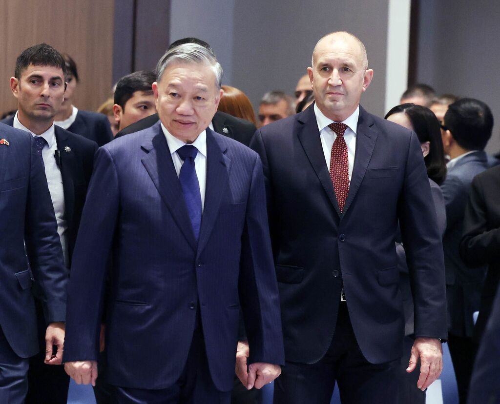 | Le secrétaire général du Parti communiste du Vietnam Tô Lâm (gauche) et le président bulgare Rumen Radev arrivent au Forum d’affaires Vietnam - Bulgarie. |