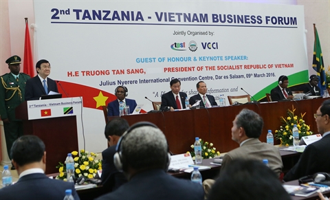 | Truong Tân Sang (gauche) au forum d’affaires Vietnam - Tanzanie, le 9 mars. |