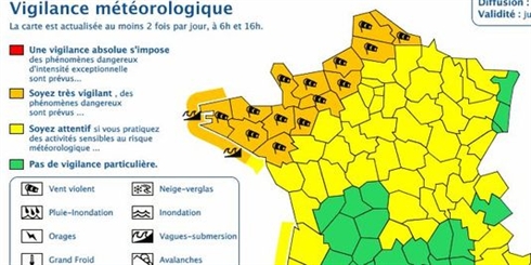 Le littoral de ces départements est concerné par le phénomène vagues-submersion. Le long de ce littoral, les très forts déferlements associés à ces puissantes vagues de secteur Ouest à Sud-Ouest et la surélévation importante du niveau d'eau au moment de la pleine mer (surcote de l'ordre 65 cm) risquent d'engendrer des submersions sur les parties basses ou vulnérables des littoraux des départements placés en vigilance orange, ajoute Météo France.