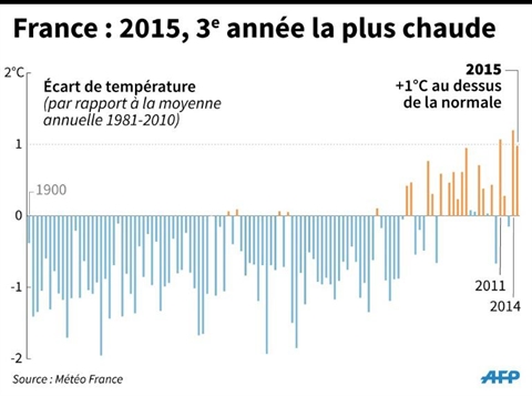 "2015 se place au 3e rang des années les plus chaudes" avec une moyenne de 1°C au-dessus de la normale, indique un communiqué de Météo-France. La normale saisonnière correspond à la moyenne au cours de la période 1981-2010.