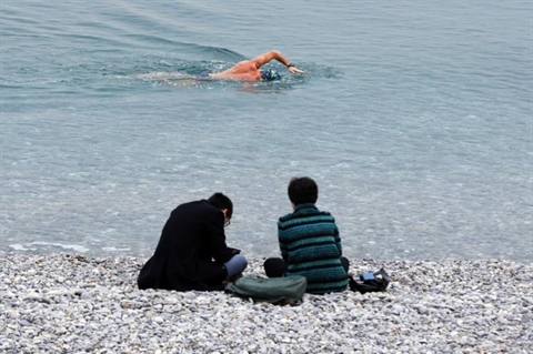 | Un nageur dans la Méditerranée, à Nice, le 18 décembre 2015. |