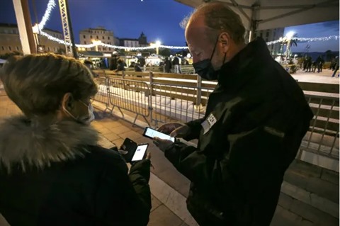 | Vérification du pass sanitaire à l'entrée du marché de Noël d'Ajaccio, en Corse, le 7 décembre. |