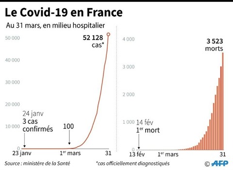 Selon le dernier bilan des autorités, l'épidémie a tué 3.523 personnes au total, dont 499 depuis lundi 30 mars. Le nombre de patients en réanimation a lui plus que doublé en une semaine et atteignait mardi soir 31 mars 5.565 (+458). Le chiffre de décès en France dépasse désormais le bilan officiel en Chine (3.305). Mais de nombreux experts, se basant notamment sur le nombre élevé d'urnes funéraires que les familles ont commencé à récupérer en Chine, estiment le nombre officiel chinois largement sous-estimé.