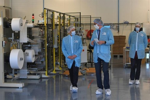 | Le président Macron (gauche) visite la PME Kolmi-Hopen qui fabrique des masques, le 31 mars à Saint-Barthélémy-d'Anjou, près d'Angers. |