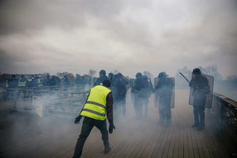 | Un "gilet jaune" face à des policiers anti-émeutes, sur un pont parisien, le 5 janvier 2019. |