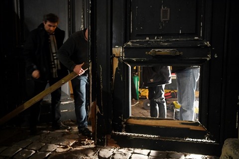 | La porte du ministère des Relations avec le Parlement défoncé par les "gilets jaunes", le 5 janvier 2019. |