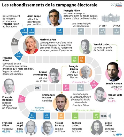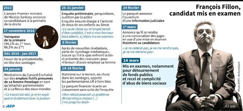 Fait inédit dans l'histoire des élections présidentielles, le candidat de la droite a été mis en examen pour détournement de fonds publics, complicité et recel de détournement de fonds publics, recel et complicité d'abus de bien sociaux et manquement aux obligations de déclaration à la Haute Autorité pour la transparence de la vie publique (HATVP).