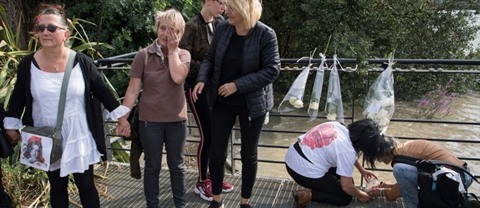 | Des gens déposent des fleurs et allument des bougies sur une jetée au-dessus de la Loire, le 30 juillet à Nantes, à l'endroit où Steve Maia Caniço a disparu. |