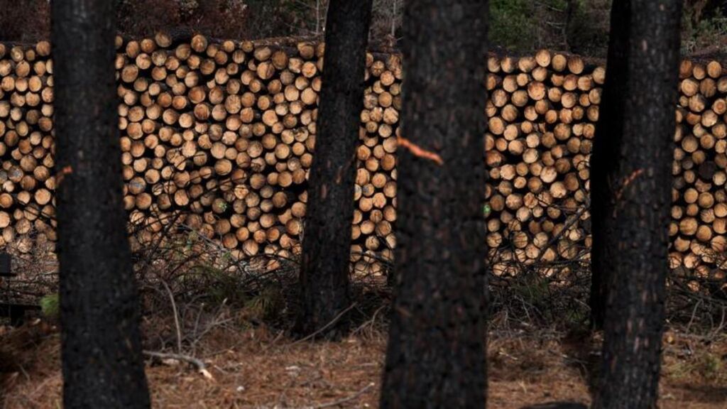 | Le long de la piste 214, qui traverse la forêt de La Teste, des milliers de rondins s’amoncellent, symboles d’une nouvelle urgence environnementale. |