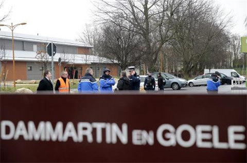 | Des officiers de police déployés à Dammartin-en-Goële, à proximité de l'imprimerie où les frères Kouachi ont entamé une prise d'otage matin du 9 janvier. |