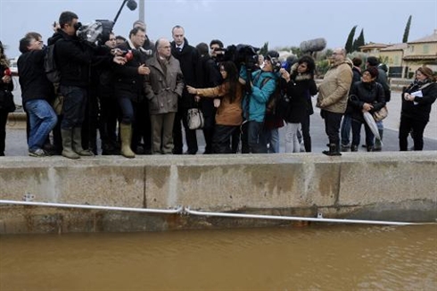 | Le ministre de l'Intérieur, Bernard Cazeneuve, devant les quais de la Maravenne à Londes après les fortes pluies, le 29 novembre 2014. |