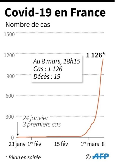 "Nous sommes toujours ce soir au stade 2, cela veut dire que notre priorité est de tout faire pour ralentir la circulation du virus sur le territoire national", a souligné M. Véran, alors que la France compte 1.126 personnes contaminées et 19 décès, faisant du pays le deuxième le plus affecté en Europe, après l'Italie. Avec 366 morts et plus de 7.300 cas confirmés, l'Italie a décidé de mettre en quarantaine 15 millions de personnes dans le Nord, soit un quart de sa population, une mesure inédite en Europe.