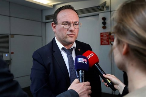 | Le député LR Damien Abad répond à des journalistes le 11 juin. |