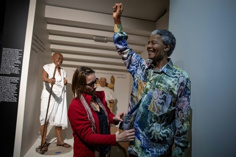| Une employée du musée Grévin habille la statue de Nelson Mandela. |