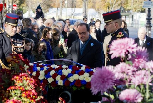 | Le président Hollande à la cérémonie du 11 novembre à Paris sur les Champs-Élysées au pied de la statue de Georges Clemenceau |