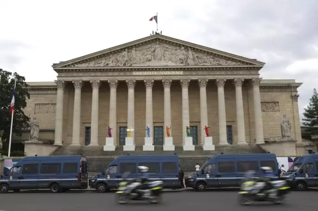 | Des véhicules de la police garés devant l'Assemblée nationale pendant le 2e tour des législatives, le 7 juillet 2024. |