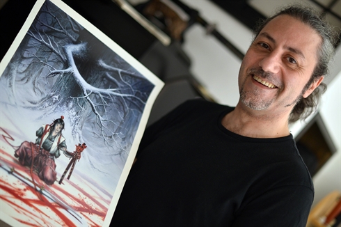 | Le dessinateur Saverio Tenuta et deux exemplaires de sa série La légende des nuées écarlates. |