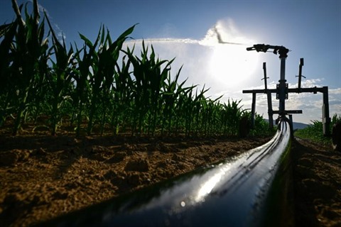 | Un arrosage automatique dans un champ près de Rouffach, dans le Haut-Rhin, le 15 juin. |