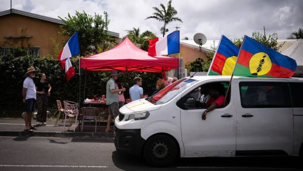 | Des habitants célèbrent l'anniversaire de la prise de possession de la Nouvelle-Calédonie par la France, tandis qu'une voiture occupée par des indépendantiste passe dans une rue de Nouméa, dans le quartier de Magenta, le 24 septembre 2024. |