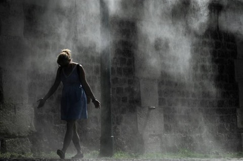 | Une passante se rafraîchit sous un brumisateur sur les bords de Seine à Paris, le 25 juillet. |